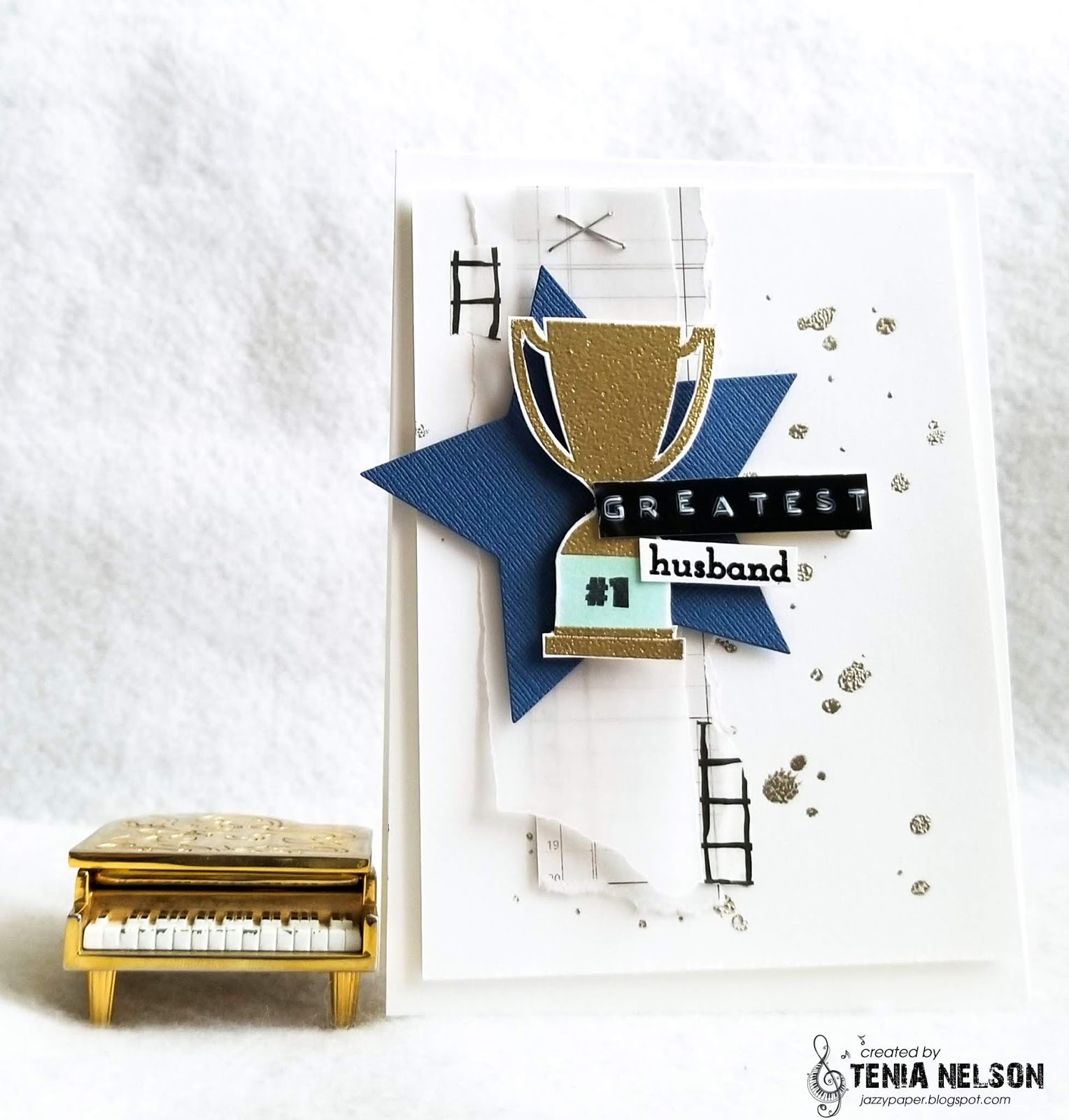 2. Stamp and heat emboss trophy image(with Gold Embossing Powder) onto a piece of white cardstock.
